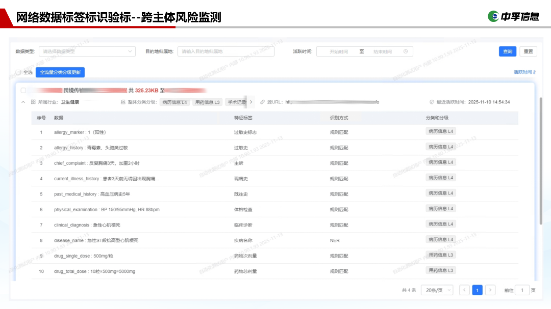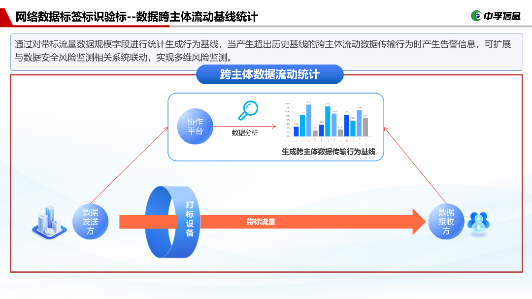 构建多维风险监测体系,生成数据量、跨主体目标、流动特征标签范围等多重基线,对异常数值实时告警;同时实现跨主体数据的分类统计与一致性核查;